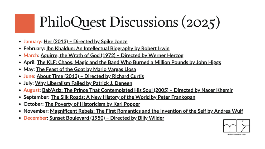 We meet once a month to discuss a book and/or a movie (schedule and lineup below).